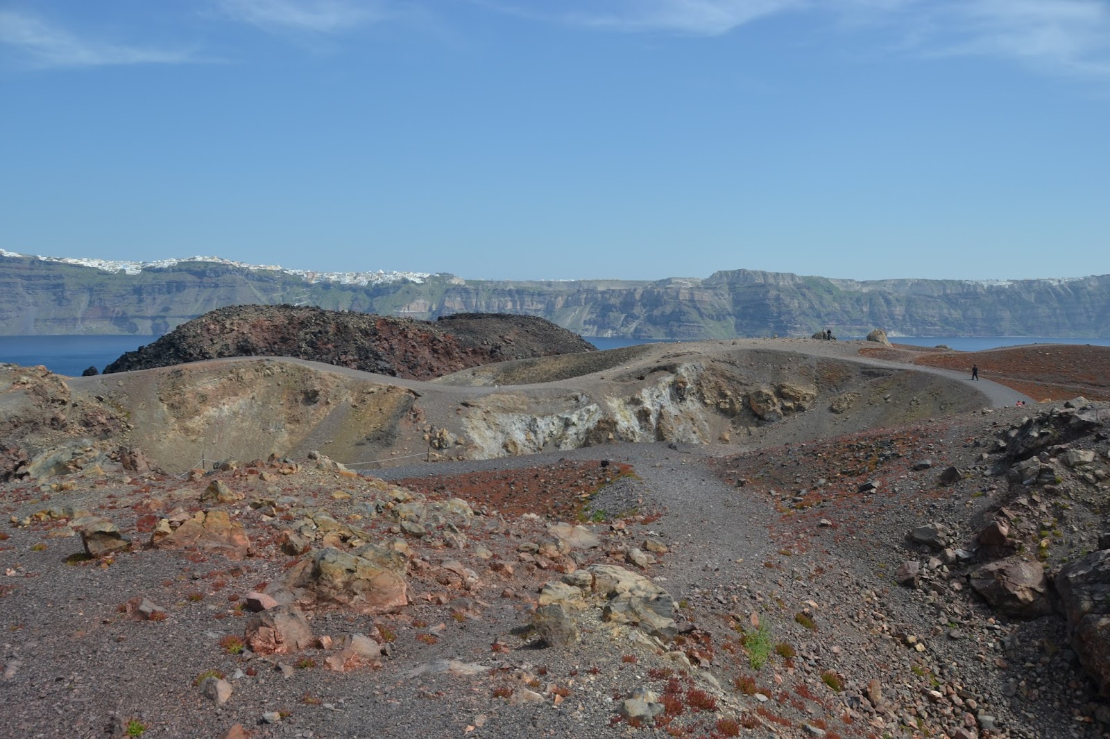 While Caitlin, Bethany and Amy were still in a shop, I wandered out and along the edge of the city. I looked out over the water at the volcano we climbed earlier. Behind it to the left I could see the tip of the island where Kate, Jess and I had climbed down the rocks and cliffs. To the right (a little out of the picture) was Oia where we had seen the sunset the night before.